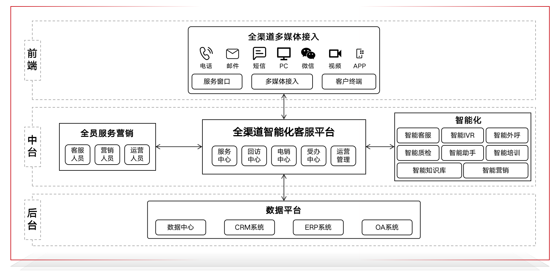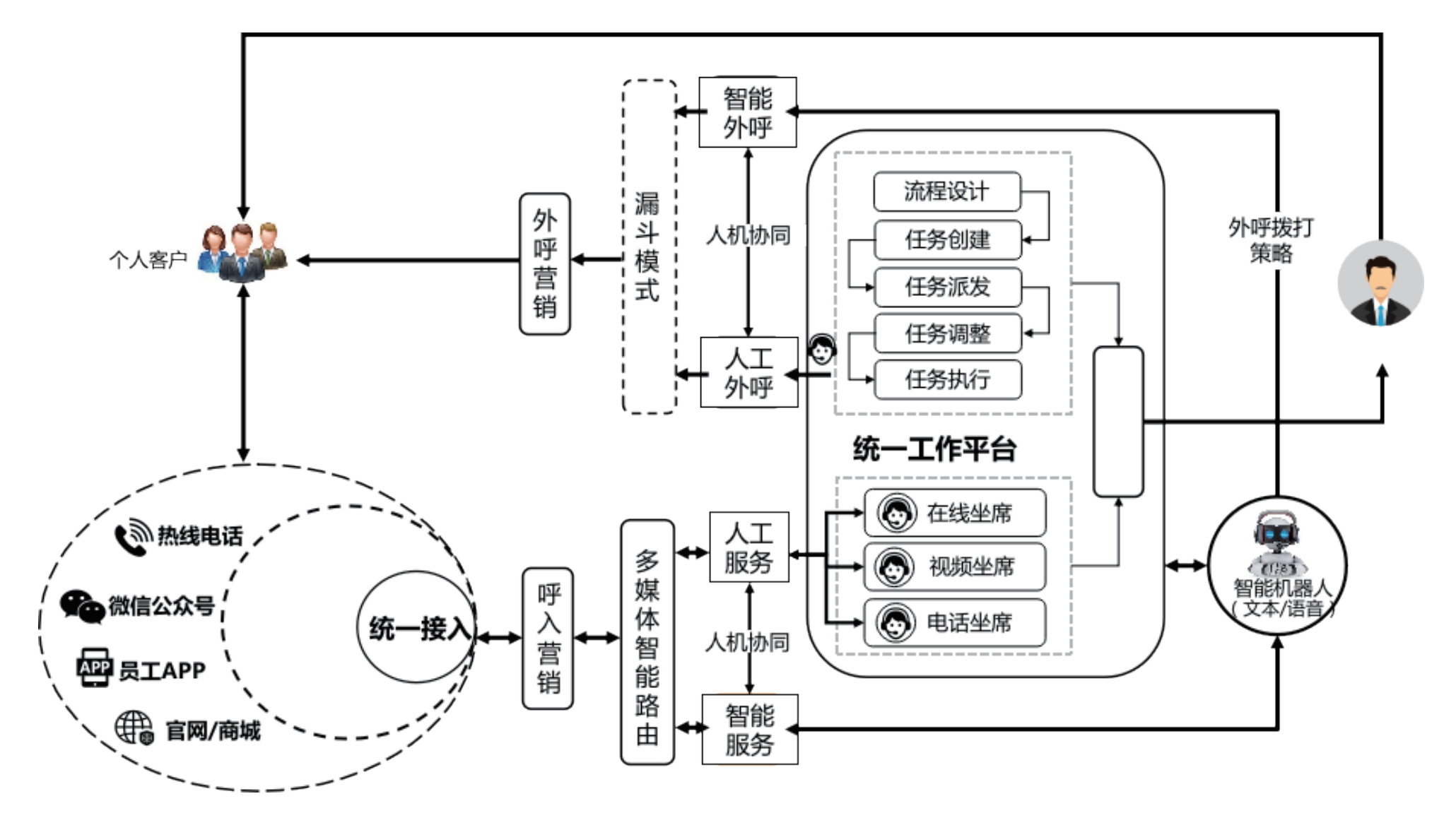 全渠道客服中心系統融合電話、短信、郵件、微信、APP、網站等多媒體渠道統一接入,提供企業對外統一服務品牌 提供客服人員打造一站式客服工作平臺,坐席人員無需在多個系統中進行切換,提高工作效率;實現客戶服務記錄的整合,使客戶通過各個渠道與公司的接觸記錄進行統一管理 提供完善的客戶服務功能,包括全渠道全業務坐席工作平臺、客戶來電頁面、統一智能路由、外呼任務中心、全媒體質檢管理、工單管理、知識庫管理、流程
