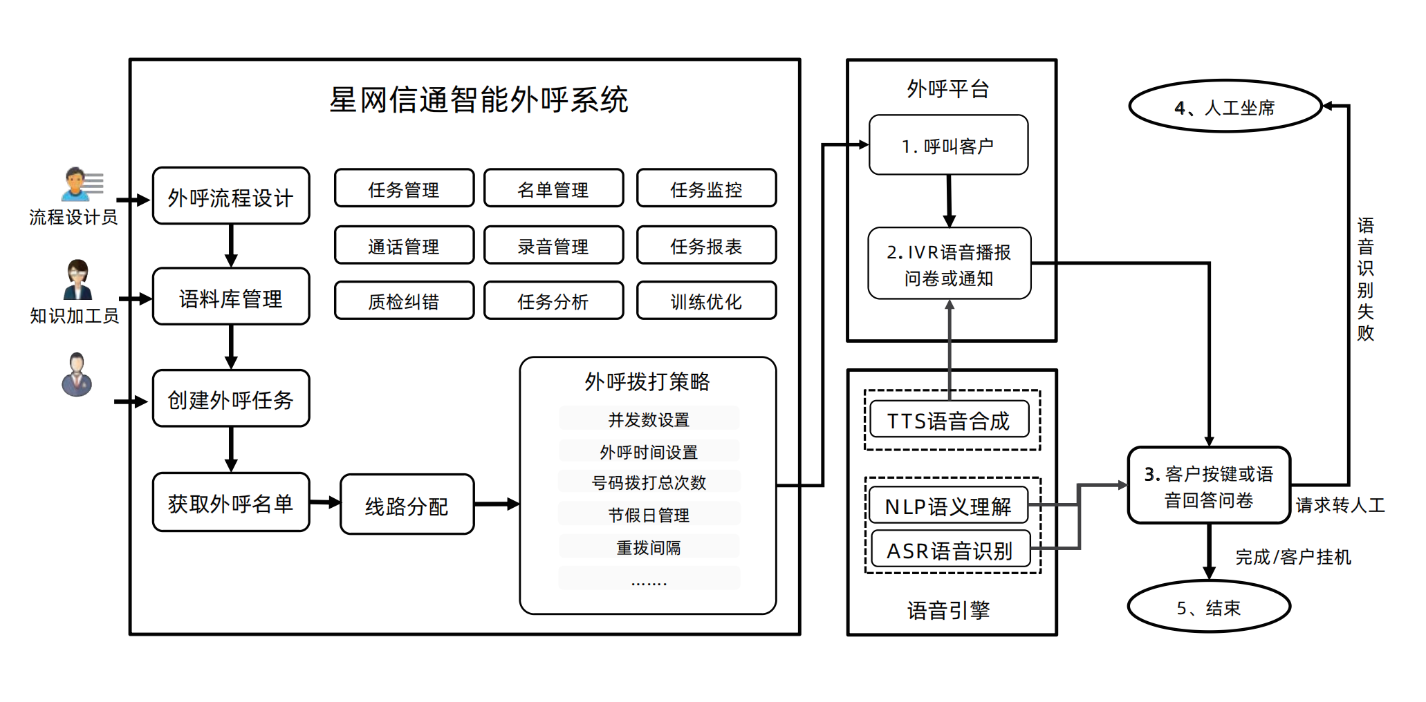 more星網信通智能外呼系統廣泛應用與行業標準化外呼、營銷、通知等業務場景。該系統利用語音識別、語音 合成、自然語言理解等人工智能技術,結合多樣化的外呼場景,實現擬人化的外呼智能語音交互,構建的 一個“話術標準、應答智能、語音真實、情緒穩定、永不疲倦、成本低廉”的客戶外呼系統,大大節約人 力成本。